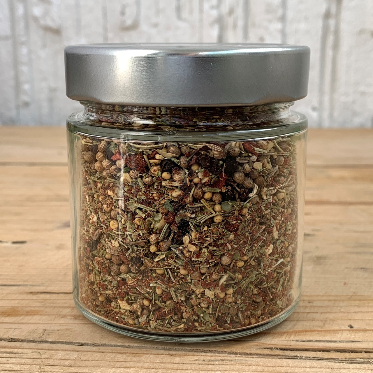 Склад: базилік, гірчиця біла, зіра ціла, коріандр копчений, коріандр цілий, майоран, паприка червона, перець чорний горошок, розмарин, часник.